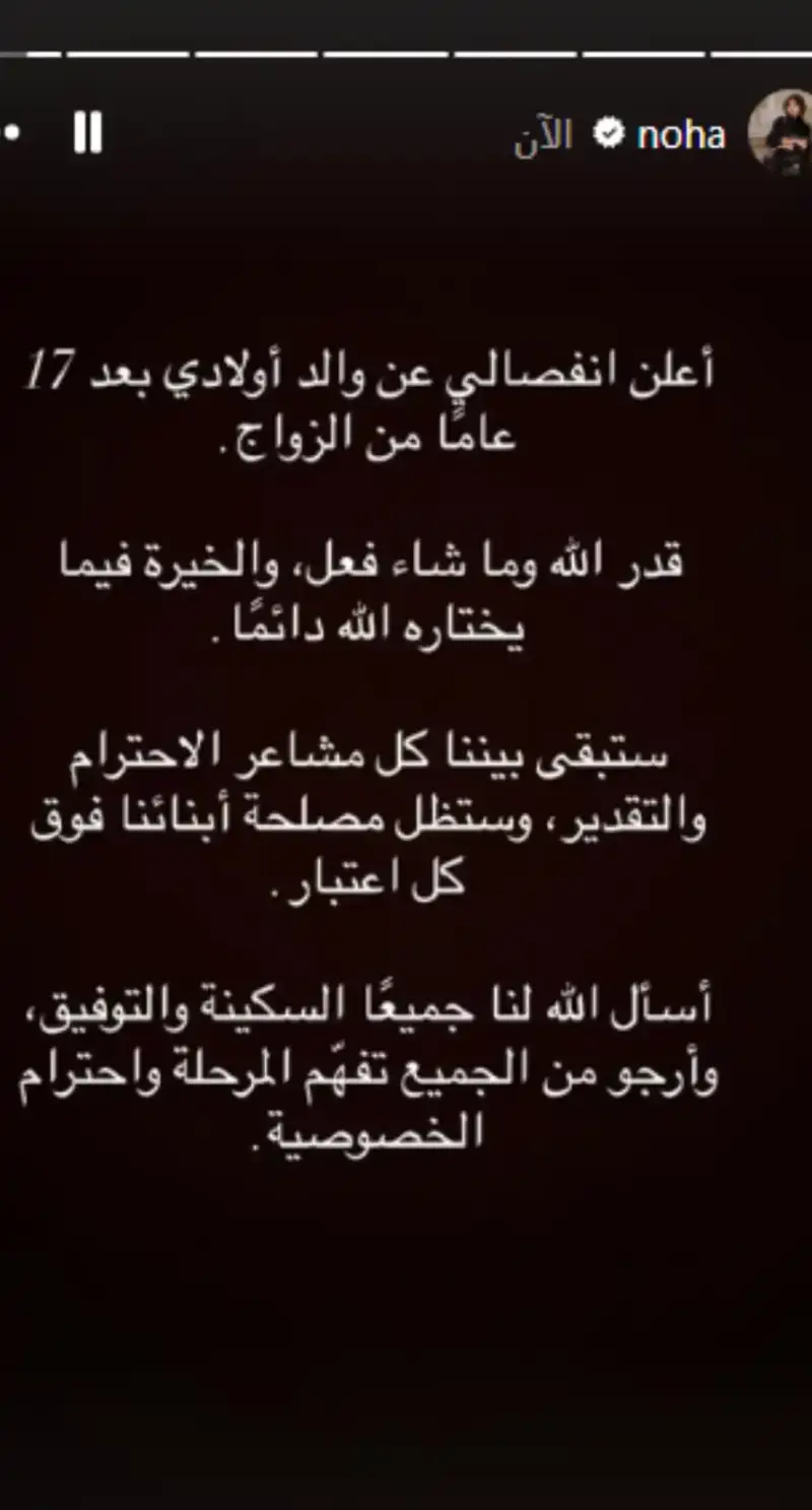 وكشفت نبيل خبر الطلاق عبر خاصية القصص القصيرة "الستوري" في إنستغرام، مؤكدة انفصالها عن زوجها بعد سنوات طويلة من الزواج، مشيرة إلى أن العلاقة بينهما ستظل قائمة على التقدير والاحترام من أجل أبنائهما.
