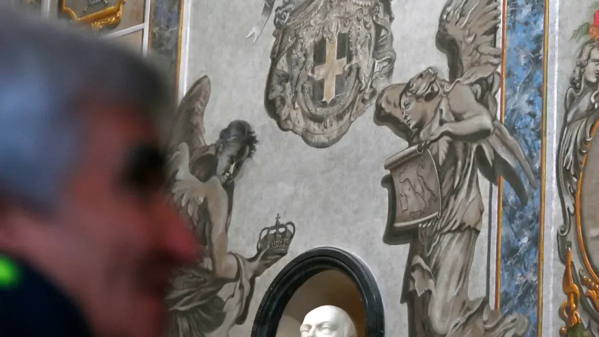 وإلى يمين تمثال نصفي من الرخام لأومبرتو الثاني، آخر ملوك إيطاليا، يظهر ملاك يحمل لفافة عليها خريطة إيطاليا، بملامح تُشبه إلى حد كبير ملامح رئيسة الحكومة الإيطالية المحافظة المتشددة.