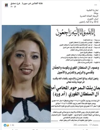 نعت نقابة الفنانين في سوريا الراحلة ونشرت نعياً عبر صفحتها الرسمية على منصة فيسبوك.