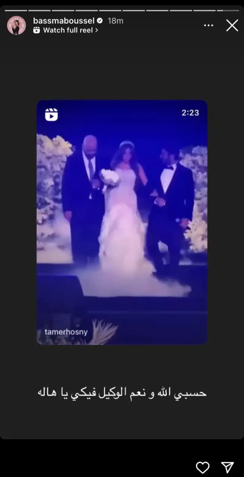 نشرت الفنانة المغربية المعتزلة بسمة بوسيل، أمس الثلاثاء، صورة من حفل زفاف هالة عمر مديرة أعمال طليقها الفنان تامر حسني، عبر خاصية استوري إنستغرام، معلقة "حسبي الله ونعم الوكيل فيكي يا هالة"، مؤكدة أنها السبب وراء انفصالها و"خراب بيتها" على حد تعبيرها.