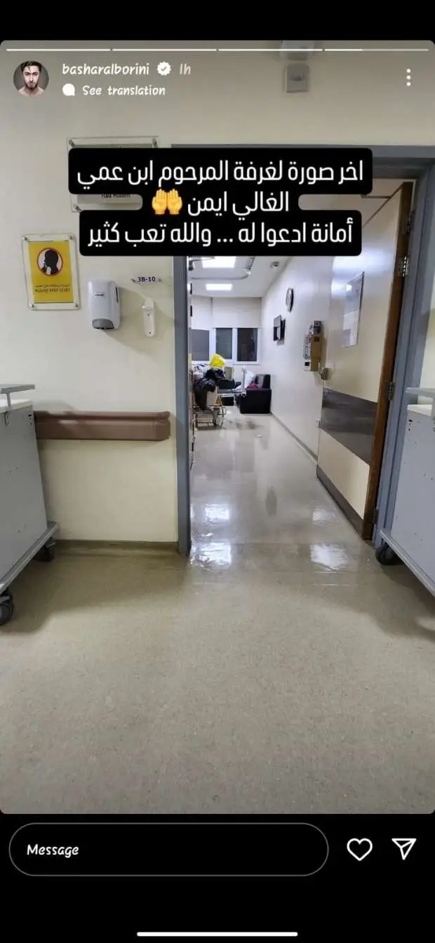 كما نشر صورة أخرى للغرفة التي شهدت اللحظات الأخيرة في حياة أيمن العلي داخل المستشفى وكتب: "آخر صورة لغرفة المرحوم ابن عمي الغالي، أمانة ادعوا له، والله تعب كثيرًا".