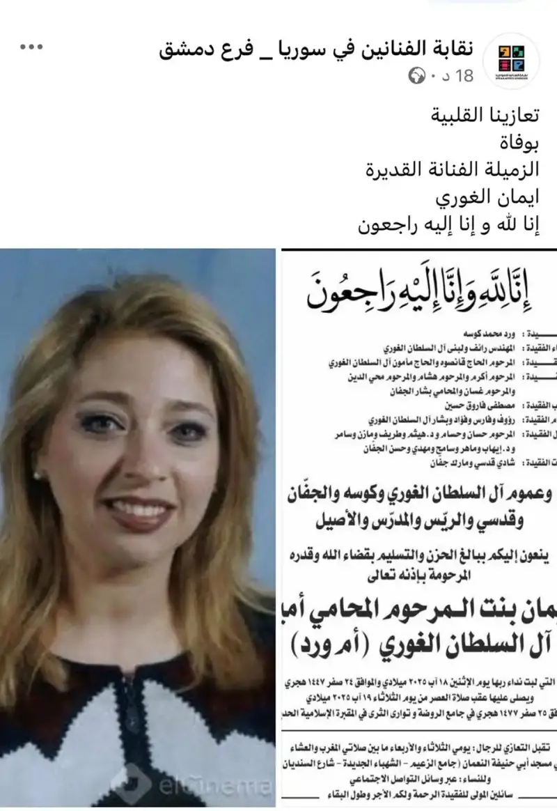 نعت نقابة الفنانين السوريين، اليوم الثلاثاء، الممثلة إيمان الغوري، والتي فارقت الحياة عن عمر 57 عاماً.