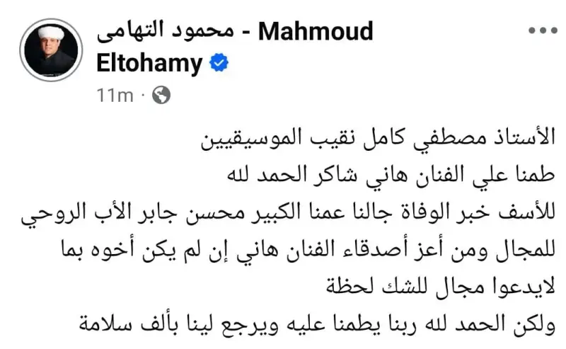 كتب المنشد المصري محمود التهامي عبر حسابه على موقع "فيس بوك" في الساعات الأولى من اليوم الخميس: "الأستاذ مصطفى كامل، نقيب الموسيقيين، طمأننا على حالة الفنان هاني شاكر.. الحمد لله".