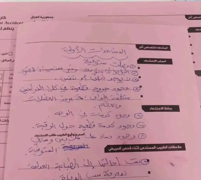 وجاء في التقرير المتداول أن حالة جثة الطبيبة العراقية كانت وقت وصولها المستشفى بدون نبض، هذا إلى جانب وجود جروح قطعية في كلا الذراعين لدرجة أنه كان هناك بروز للعظام والعضلات.