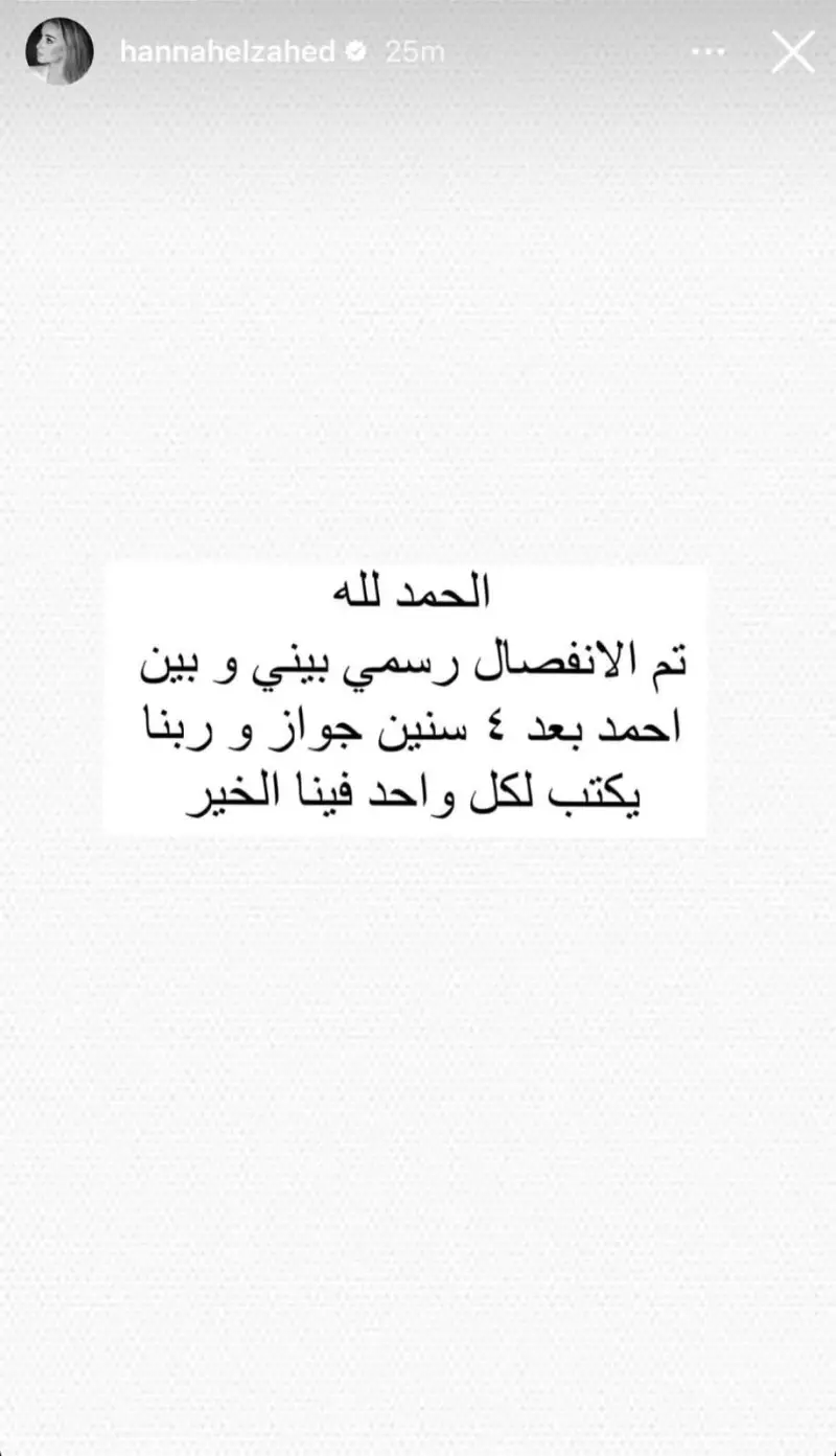 وأكدت الزاهد في منشور عبر خاصية القصص المصورة على صفحتها في "إنستغرام" طلاقهما بعد زواج استمر 4 سنوات، وقالت "الحمدلله.. تم الانفصال بيني وبين أحمد بعد 4 سنين جواز".