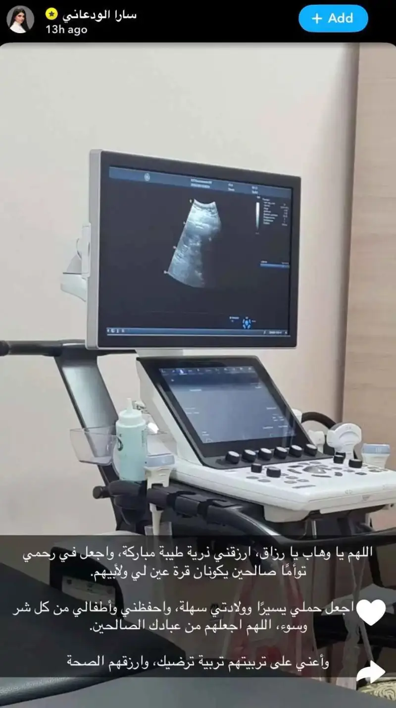 وأرفقت الصورة بدعاء جاء فيه: "اللهمّ يا وهّاب يا رزّاق، ارزقني ذرية طيبة مباركة، واجعل في رحمي توأمين صالحَين يكونان قرّة عين لي ولأبيهما".