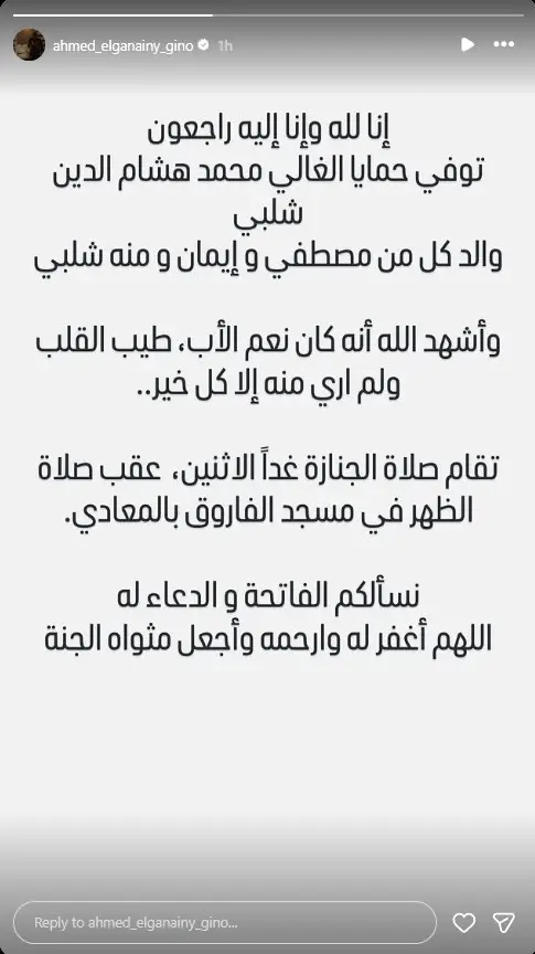 وأوضح في منشوره أن الفقيد هو محمد هشام الدين شلبي، والد منة وشقيقيها مصطفى وإيمان، مشيرًا إلى عمق العلاقة الإنسانية التي جمعته بأسرته، وهو ما انعكس في كلمات النعي التي لاقت تفاعلًا واسعًا.