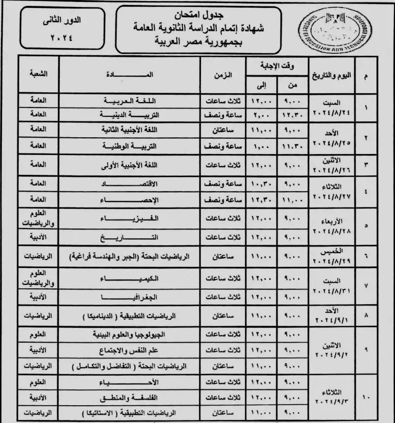 وفيما يلي جدول امتحانات الثانوية العامة الدور الثاني 2024 لمدارس الجمهورية والمكفوفين ومدارس المتفوقين في العلوم والتكنولوجيا STEM:
