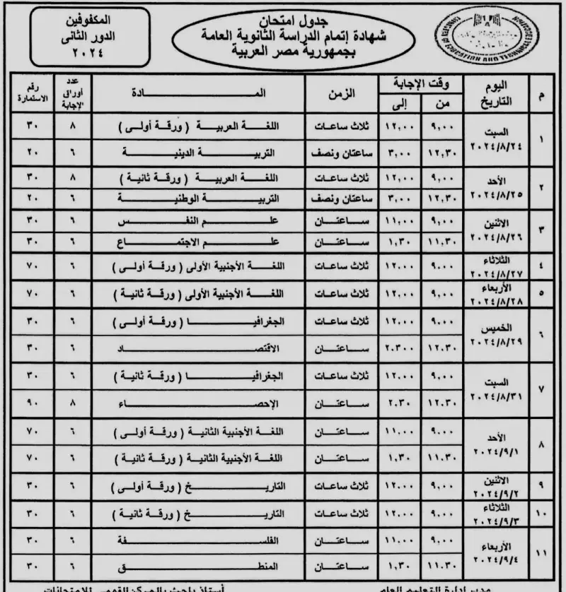 جدول امتحانات الدور الثاني 2024