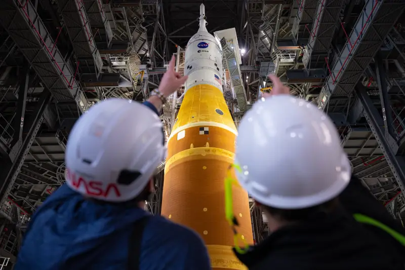 وتجمع هؤلاء قبل انطلاق صاروخ نظام الإطلاق الفضائي من المبنى، الذي تم تشييده خلال ستينيات القرن الماضي لصواريخ ساتورن 5 التي أرسلت 24 رائد فضاء إلى القمر ضمن برنامج أبولو.