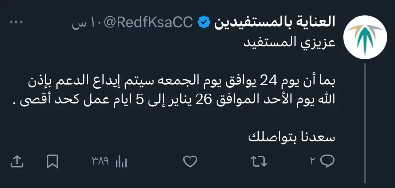 ومع اقتراب موعد صرف شهر يناير 2025، تساءل الكثير من المستفيدين عن موعد نزول الدعم السكني 2025، بما أن يوم 24 يناير سيوافق الجمعة؛ العطلة الرسمية في البلاد، وبالرد على سؤال أحد المستفسرين عبر حساب العناية بالمستفيدين على موقع إكس، تم الكشف أن موعد الصرف سيكون يوم الأحد الموافق 26 يناير لـ 5 أيام عمل كحد أقصى.