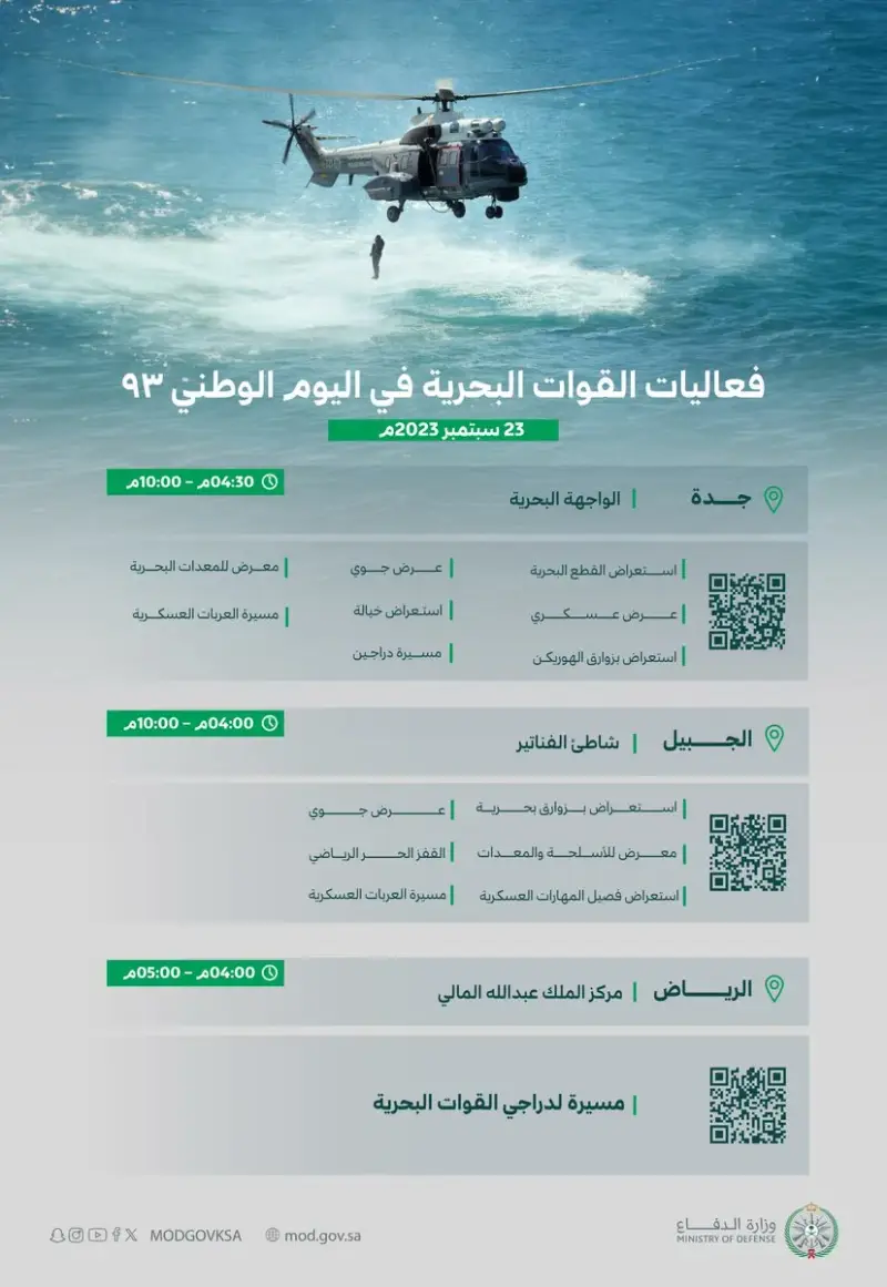 تشارك القوات البحرية في جدة والرياض والجبيل، بعروض بحرية ممتعة، غدًا السبت، احتفالًا باليوم الوطني السعودي، ومن المقرر أن تبدأ من الساعة 4 عصرًا، بعرض عسكريّ واستعراض القطع البحرية، بالإضافة إلى استعراض بزوارق الهوريكن ومسيرة للعربات العسكرية.