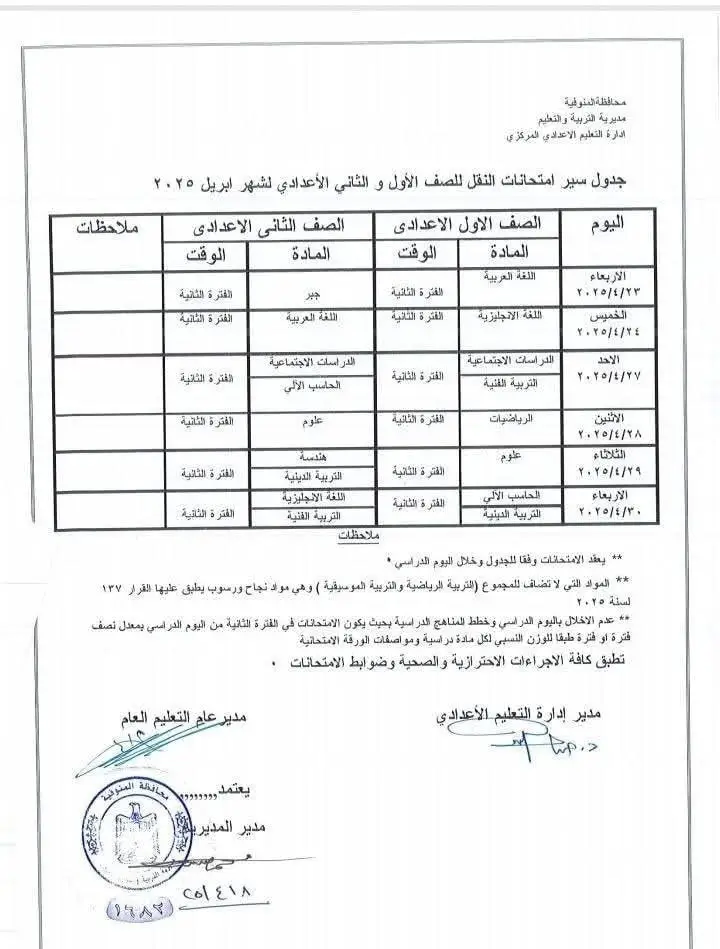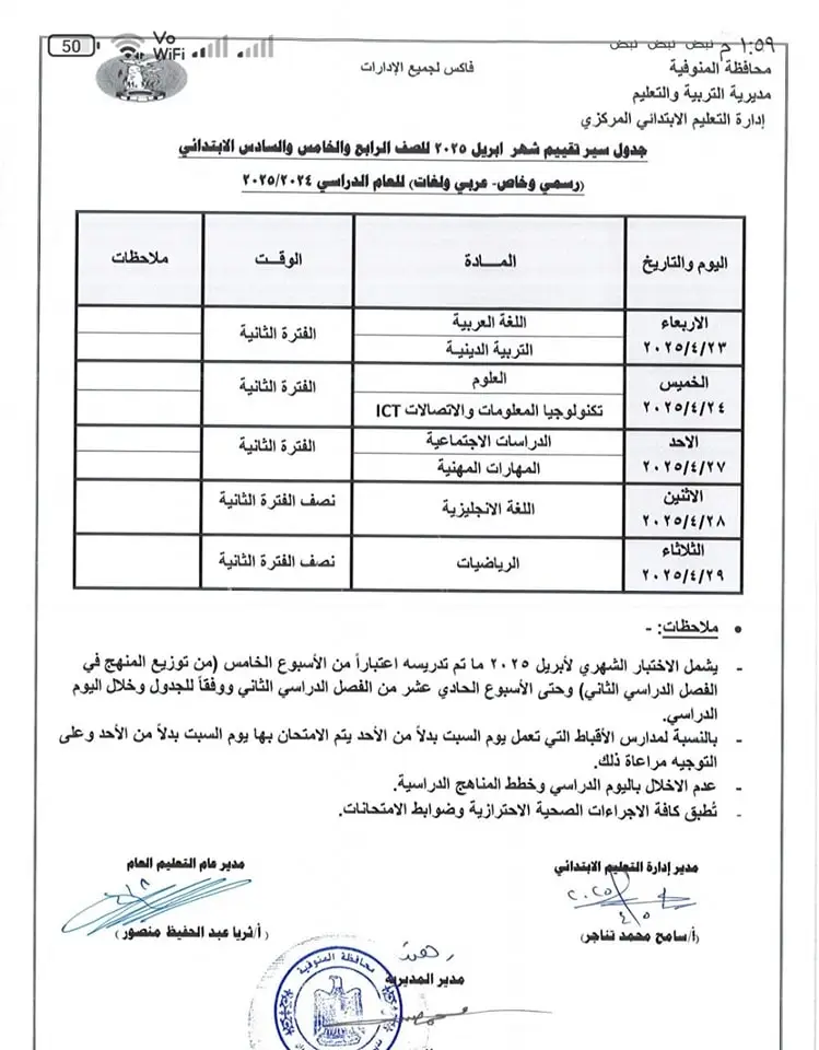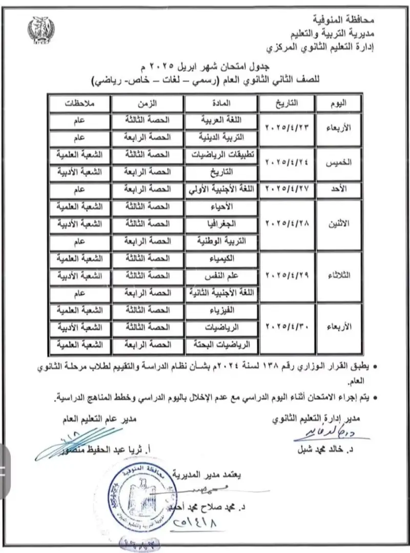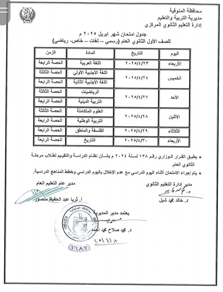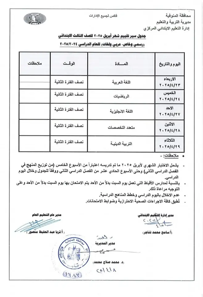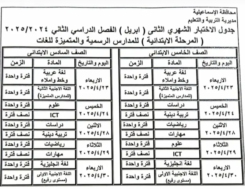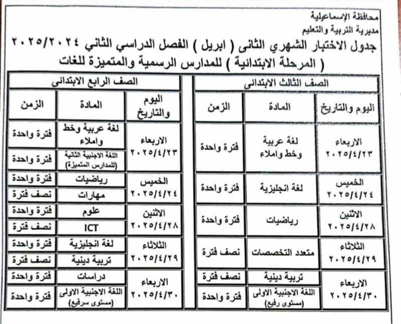 فيما يلي جداول امتحانات شهر أبريل جميع الصفوف في المحافظات: