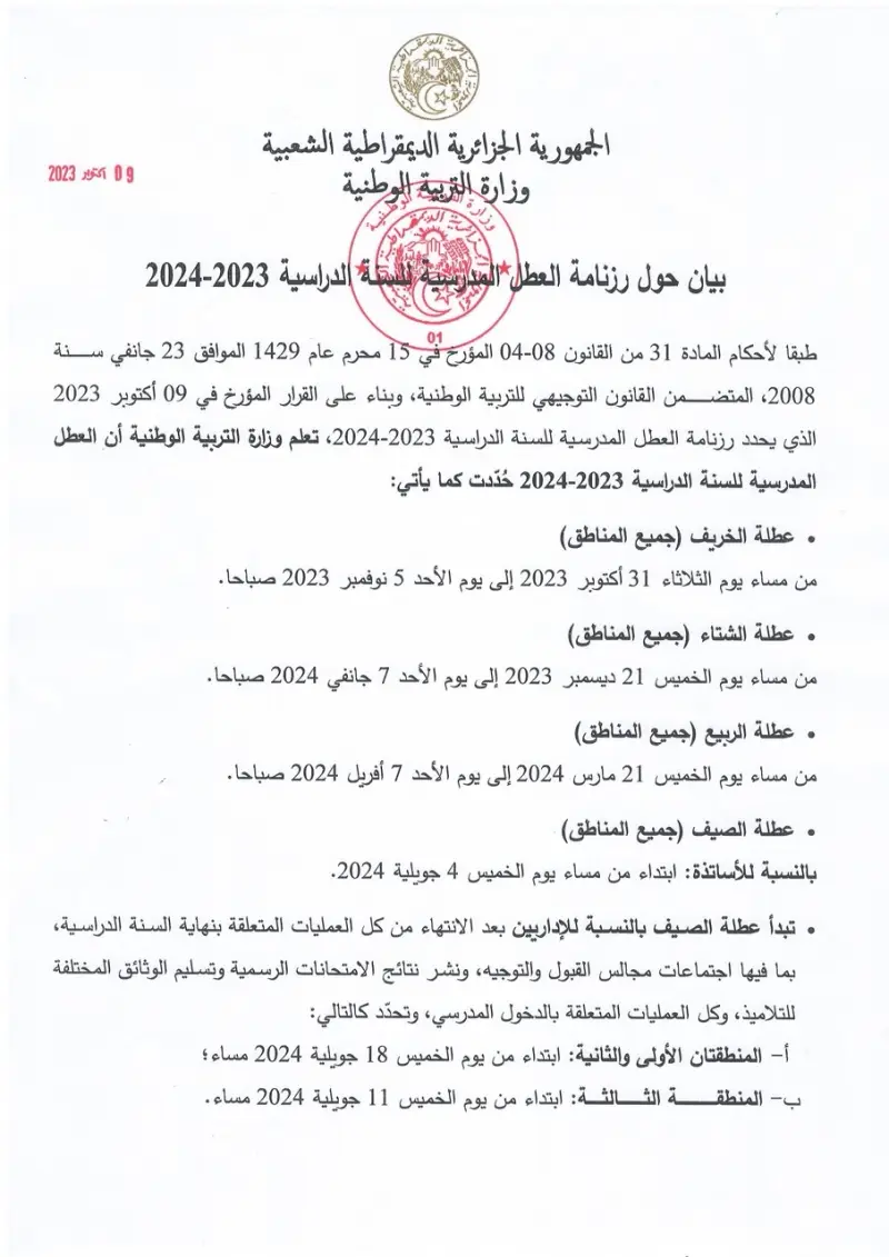مع بداية العام الدراسيّ الحاليّ، أعلنت وزارة التربيّة الوطنيّة الجزائريّة عن رزنامة العطل المدرسية 2024 الجزائر، طبقًا لأحكام المادة 31 من القانون 04-08 المؤرخ في 23 يناير 2008، وبناء عليه تأتي رزنامة العطل المدرسية 2023-2024 كما يلي: