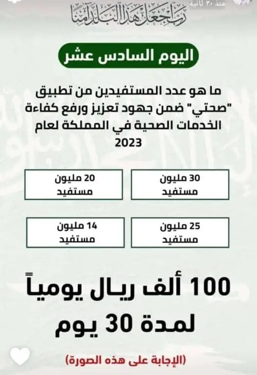 ما هو عدد المستفيدين من تطبيق صحتي ضمن جهود تعزيز ورفع كفاءة الخدمات الصحية في المملكة لعام 2023؟.. تصدر السؤال محركات البحث خلال الساعات الماضية، في إطار سعي المواطنين للفوز في مسابقة تبلغ قيمة جائزتها 100 ألف ريال سعودي.
