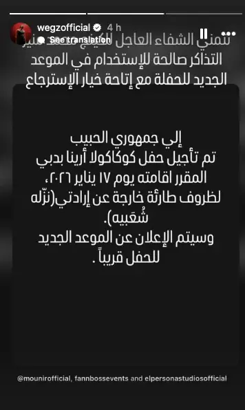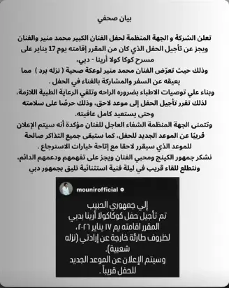 كتب منير عبر حسابه الشخصي على موقع "فيسبوك"، "إلى جمهوري الحبيب، تم تأجيل حفل كوكاكولا أرينا بدبي المقرر إقامته يوم 17 يناير 2026، لظروف طارئة خارجة عن إرادتي (نزلة شعبية)، وسيتم الاعلان عن الموعد الجديد للحفل قريباً".
