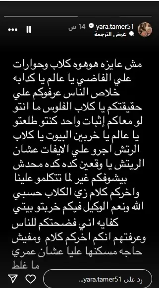 وأوضحت يارا أنها تعلم أنه كان يجب ألا تخرج وتتحدث في الأمر مؤكدة أن كرامتها والدفاع عن شرفها هو الذي دفعها لذلك.
