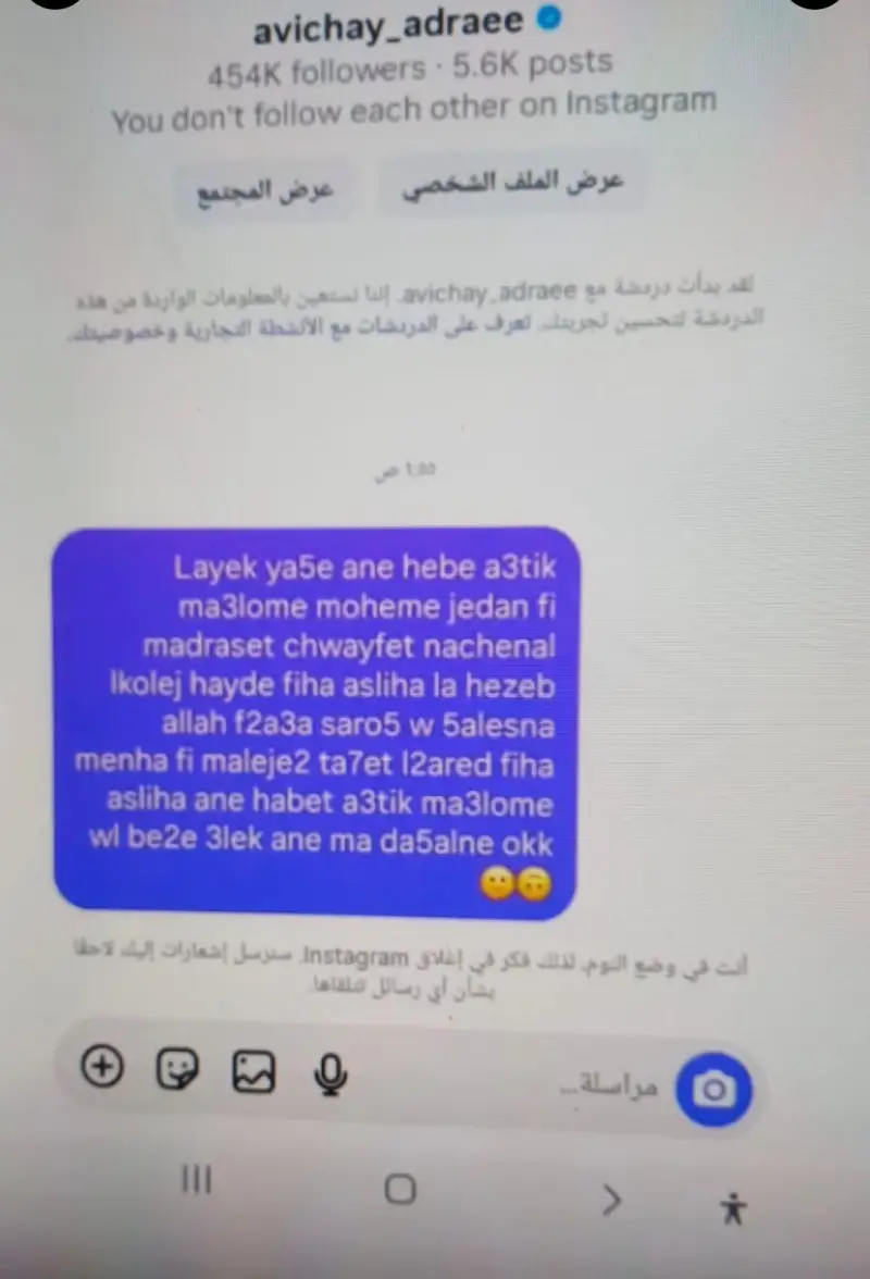 تداول الإعلام اللبناني ومواقع التواصل الاجتماعي على نطاق واسع اليوم، خبرا مفاده بأن طالبة في إحدى المدارس وجّهت رسالة إلى المتحدث باسم الجيش الإسرائيلي أفيخاي أدرعي تدعي فيها وجود سلاح تحت مدرستها.
