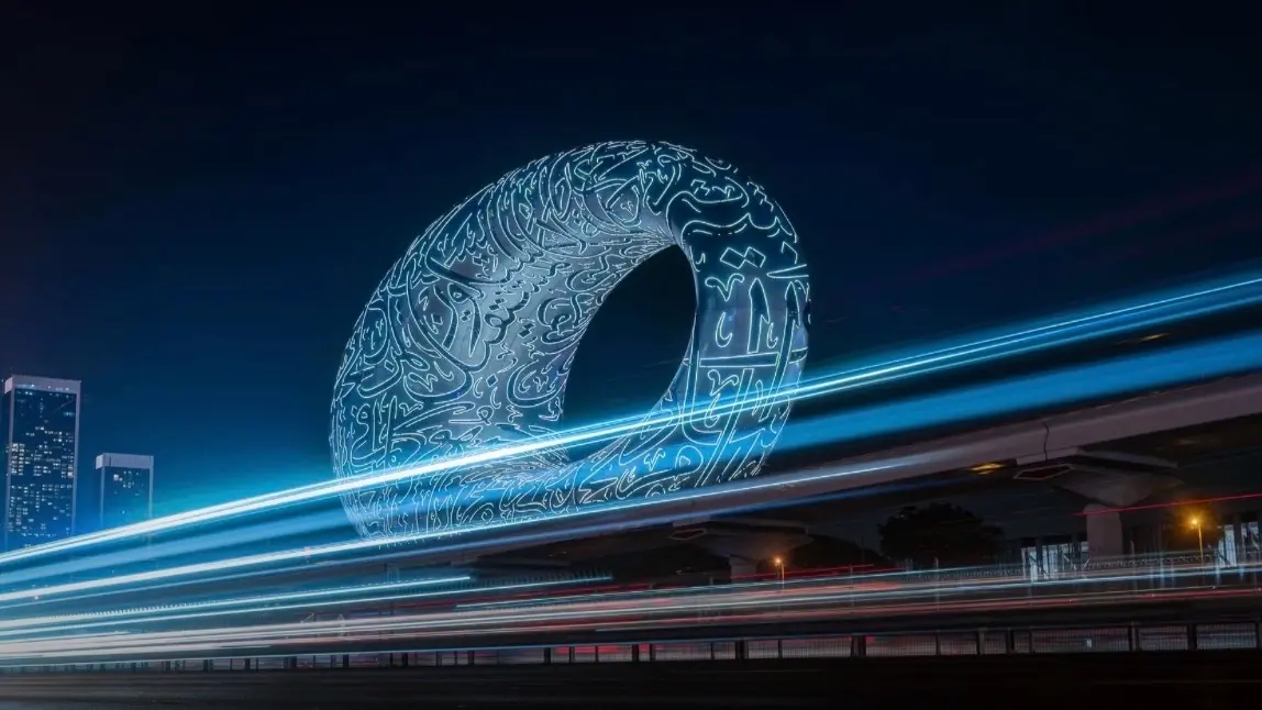 ويجسد مبنى المتحف، بارتفاع 77 مترًا وواجهة تضم 1024 قطعة تغطي مساحة 17,600 متر مربع ومزينة بالخط العربي، رؤية دبي في تحويل الأفكار الطموحة إلى واقع ملموس.