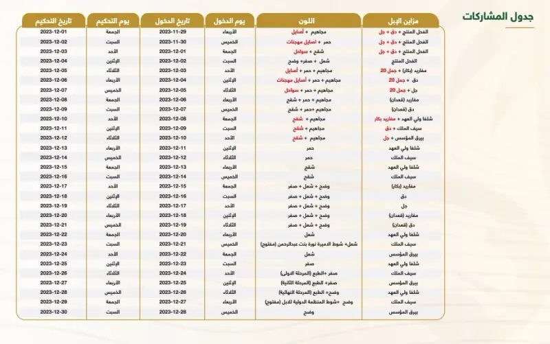 كشف نادي الإبل المنظم لفعاليات النسخة الثامنة من مهرجان الملك عبد العزيز للإبل، عن جدول مزاين الصياهد 2023-2024 الذي من المقرر أن يستمر حتى الأيام الأولى لشهر يناير 2024، ويكون الجدول كالتالي: