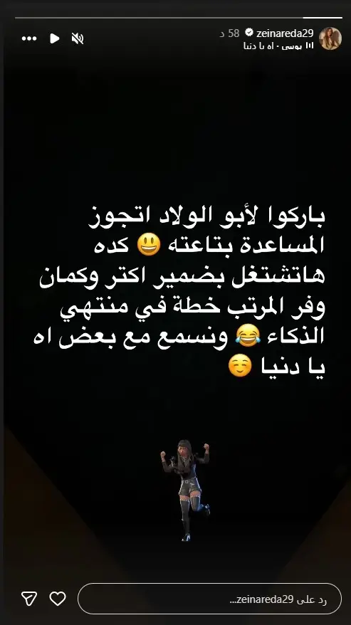 نشرت الفنانة زينة عبر خاصية القصص القصيرة على "إنستغرام" تعليقًا لاذعًا حمل سخرية واضحة، تحدثت فيه عن زواج والد أبنائها من مساعدته الخاصة، مستخدمة عبارات تهنئة ممزوجة بتلميحات ساخرة.
