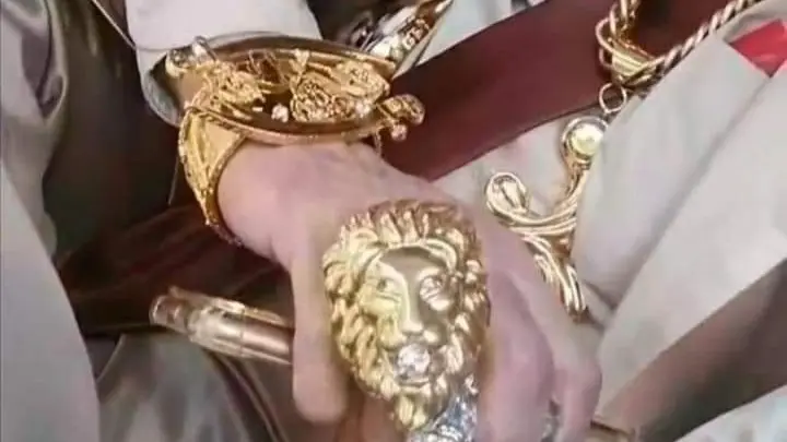 فأبو علي يتزيّن يوميا باكسسوارات ذهبية يصل وزنها إلى أكثر من 2 كغ، وأثقل قطعة يرتديها هي "طوق" بنهايته سيف يصل وزنه إلى 1 كغ من الذهب.