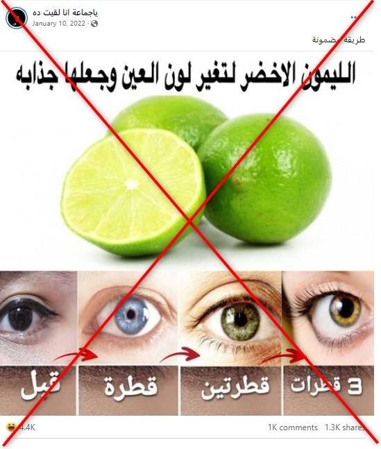 "الليمون الأخضر لتغيير لون العين وجعلها جذابة" بهذا التعليق يروّج مستخدمون "لوصفة" يدّعون أنها مضمونة ويرفقونها بصورة تظهر كيف يتغيّر لون العين من البنيّ إلى الأخضر في حال اتّباعها.