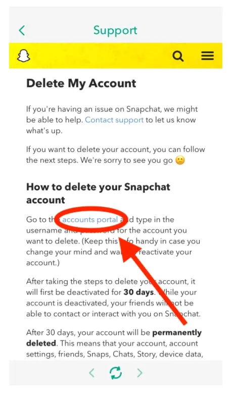ملحوظة: يوجد خطوة مهمة عند حذف حسابك على تطبيق سناب شات، وهي عدم ظهور طريقة العدم مباشرة، بينما عندما تضغط على حذف حسابي، سوف يظهر لك مقالة تتحدث عن حذف الحساب، لا تهتم بها وابحث عن كلمة باللون الأزرق " accounts portal" اضغط عليها لاستكمال الخطوات، التي تتطلب منك إدخال كلمة المرور والضغط على كلمة استمرار، وبهذه الطريقة يكون الحساب تم حذف نهائيًا.