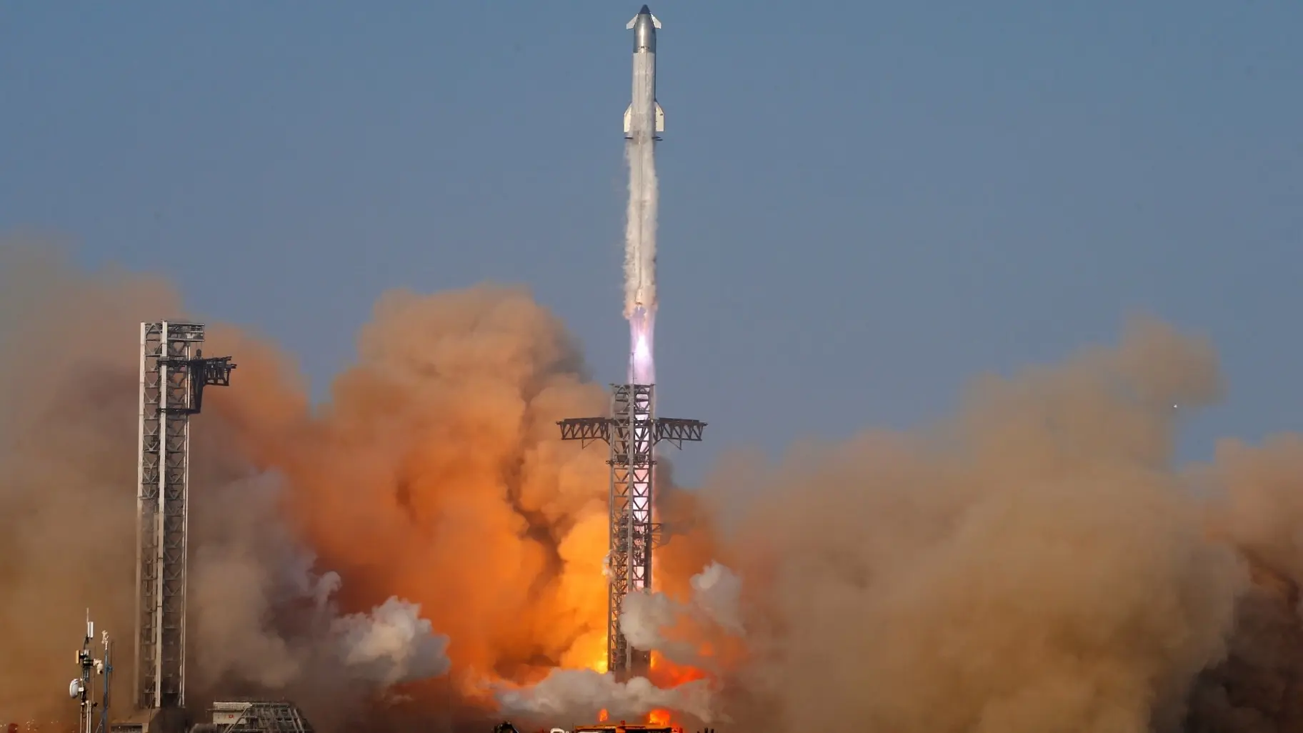 الصاروخ "ستارشيب"، الذي يبلغ طوله 123 مترا – أي ما يعادل ناطحة سحاب من 40 طابقًا – أقلع من موقع الإطلاق "ستاربيس" في ولاية تكساس، وسط سحابة دخان ضخمة وتصفيق عشرات المتفرجين على الشاطئ القريب.
