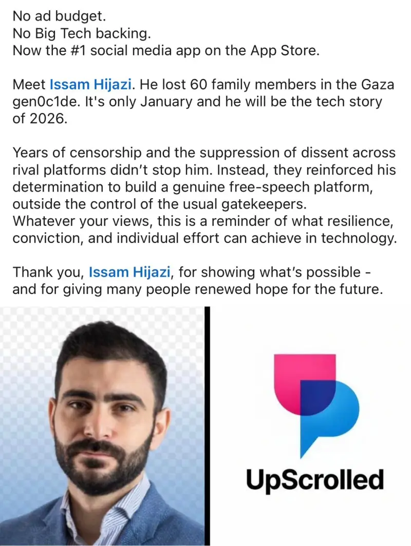 برزت قصة مؤسس تطبيق التواصل الاجتماعي "UpScrolled"، عصام حجازي، كواحدة من أكثر القصص إلهامًا في عالم التكنولوجيا.