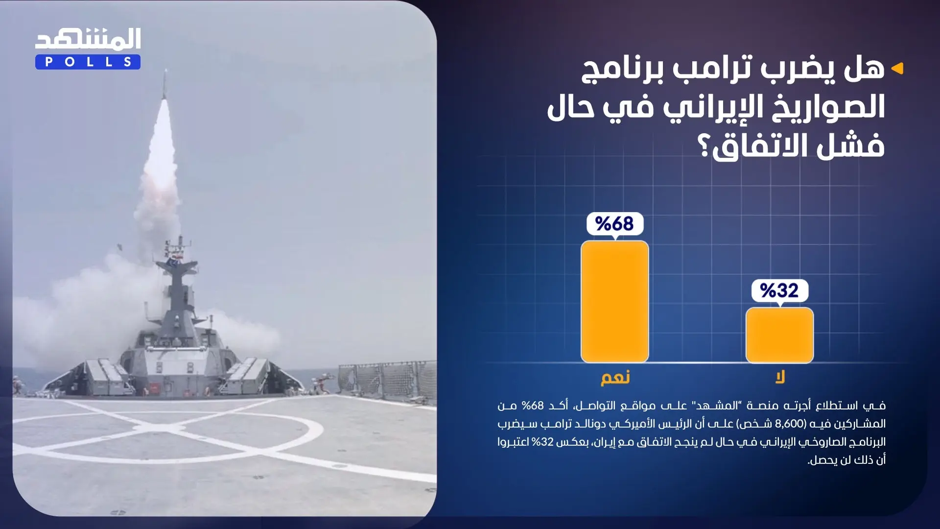 في استطلاع أجرته منصة “المشهد" على مواقع التواصل، أكد 68% من المشاركين فيه (8,600 شخص) على أن الرئيس الأميركي دونالد ترامب سيضرب البرنامج الصاروخي الإيراني في حال لم ينجح الاتفاق مع إيران، بعكس 32% اعتبروا أن ذلك لن يحصل.