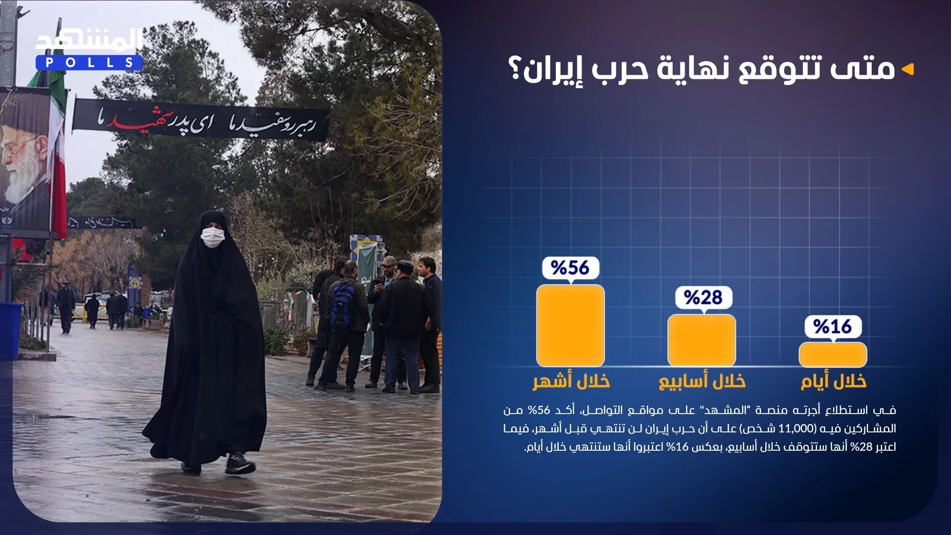 في استطلاع أجرته منصة “المشهد" على مواقع التواصل، أكد 56% من المشاركين فيه (11,000 شخص) على أن حرب إيران لن تنتهي قبل أشهر، فيما اعتبر 28% انها ستتوقف خلال اسابيع، بعكس 16% اعتبروا أنها ستنتهي خلال أيام.