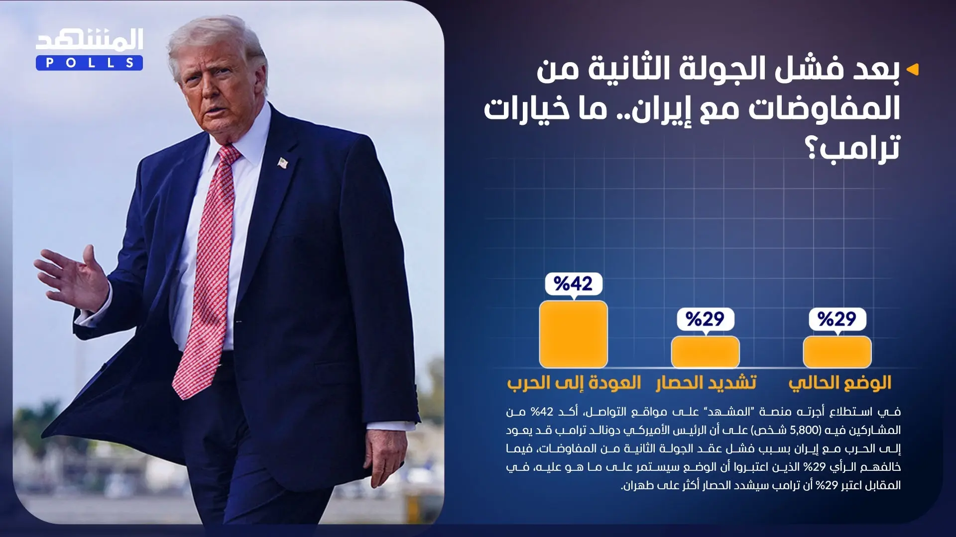 استطلاع المشهد.. خيار ترامب قد يكون العودة إلى الحرب مع إيران