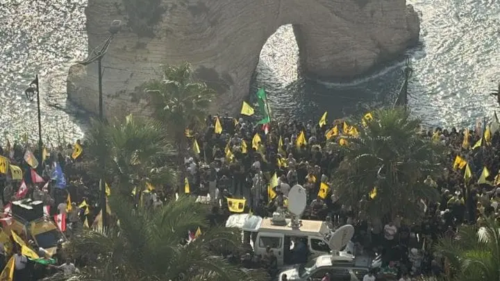 وسط إجراءات أمنية مشددة، يواصل مناصرو "حزب الله" بالتوافد إلى صخرة الروشة للمشاركة باحتفال إضاءة الصخرة الشهيرة بصور زعيميه الراحلين حسن نصر الله وهاشم صفي الدين.