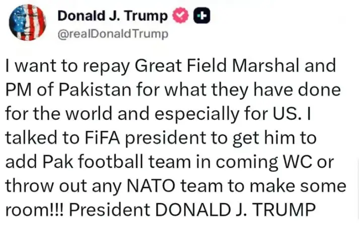 أثارت تدوينة منسوبة إلى الرئيس الأميركي دونالد ترامب جدلًا واسعًا على مواقع التواصل الاجتماعي خلال الساعات الماضية، بعدما زعمت أنه طلب من الاتحاد الدولي لكرة القدم "فيفا" إدراج منتخب باكستان في نهائيات كأس العالم 2026، بل واقترح استبعاد أحد منتخبات حلف الناتو لإفساح المجال.