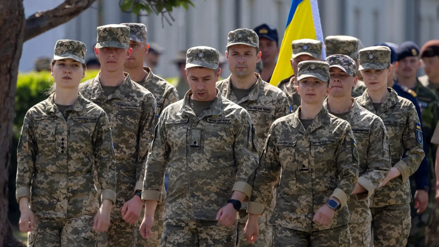 ويتألف ممثلو القوات المسلحة الأوكرانية المشاركون في الموكب يوم الاثنين من جنود منتشرين في المملكة المتحدة في إطار عملية "انترفليكس"، وهو برنامج تدريب تقدمه القوات المسلحة البريطانية للجنود الأوكرانيين، بالتعاون مع 12 دولة شريكة.