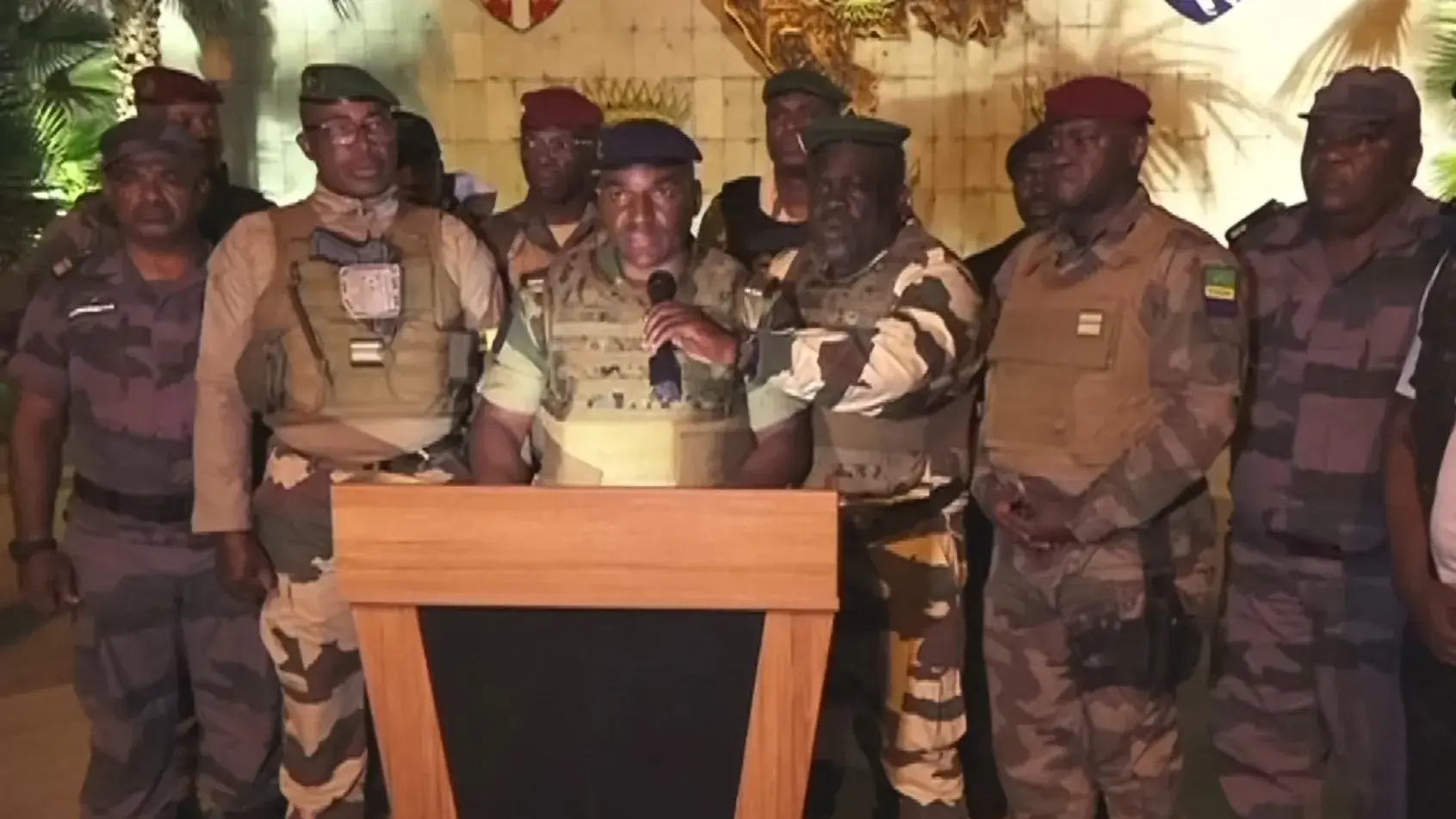وفور إعلان فوز بونغو رسميا بحصوله على 64.27% من الأصوات ليل الثلاثاء الأربعاء، ظهرت مجموعة تضم نحو 12 عسكريا عبر شاشة محطة "غابون 24" من القصر الرئاسي.