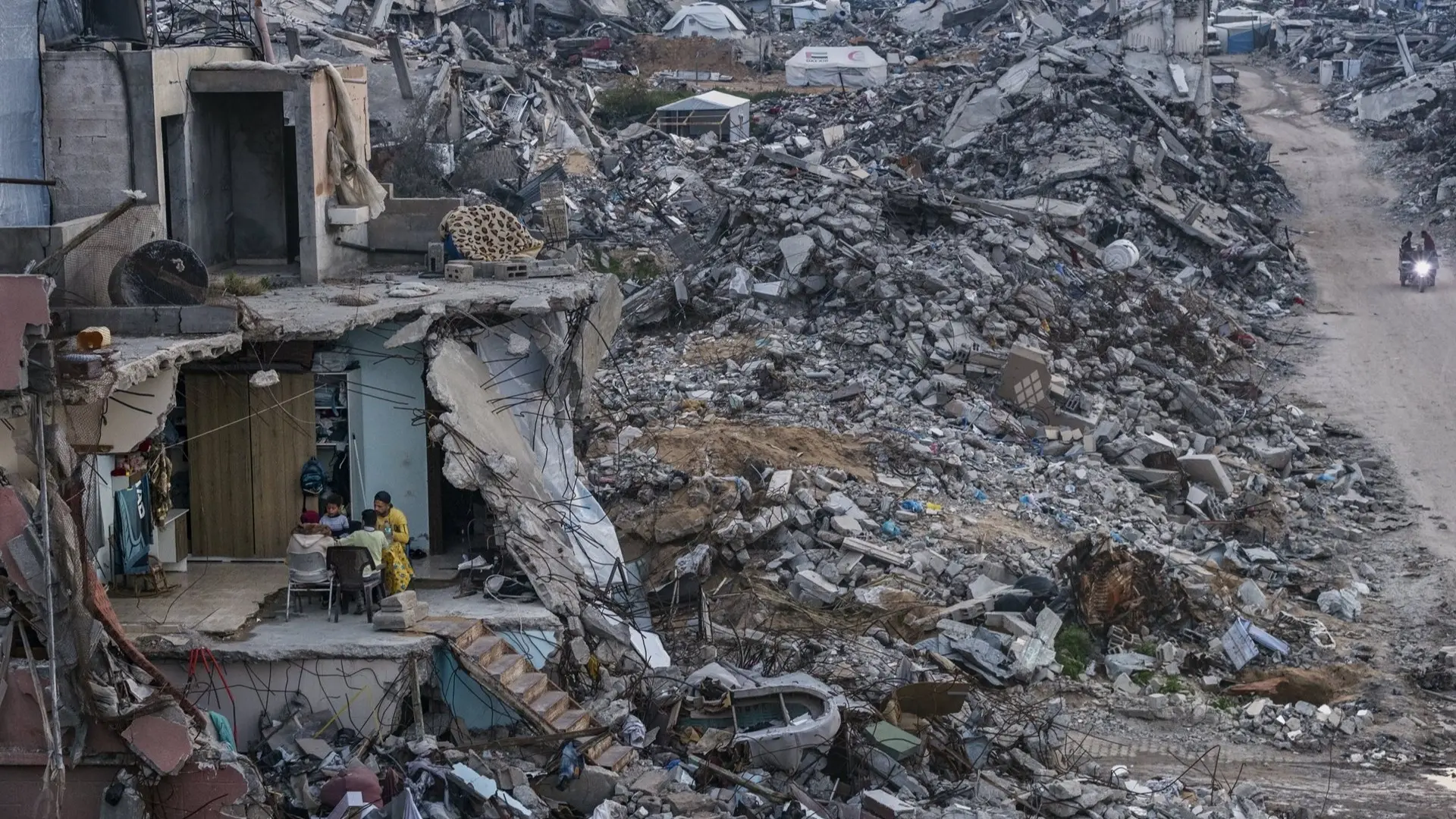وتُظهر الصور عائلة سورية تجلس أمام منزلها المتضرر بشدة، حيث تُجبر على العيش أحيانًا في الشارع أمامه.
