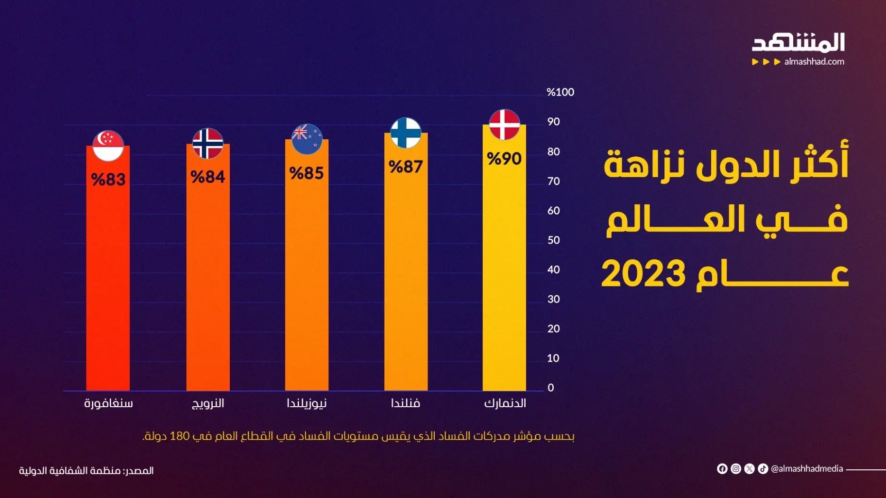 في عام 2023، كانت البلدان التي لديها أدنى مستوى من الفساد في القطاع العام، هي الدنمارك وفنلندا ونيوزيلندا، تليها النرويج وسنغافورة والسويد. وعلى الجانب الآخر من المؤشر، سجلت الصومال 11 نقطة فقط، ما يجعلها الدولة الأكثر تضررًا بالفساد في العالم. وجاءت سوريا وفنزويلا وجنوب السودان في المركز الثاني بفارق 13 نقطة.