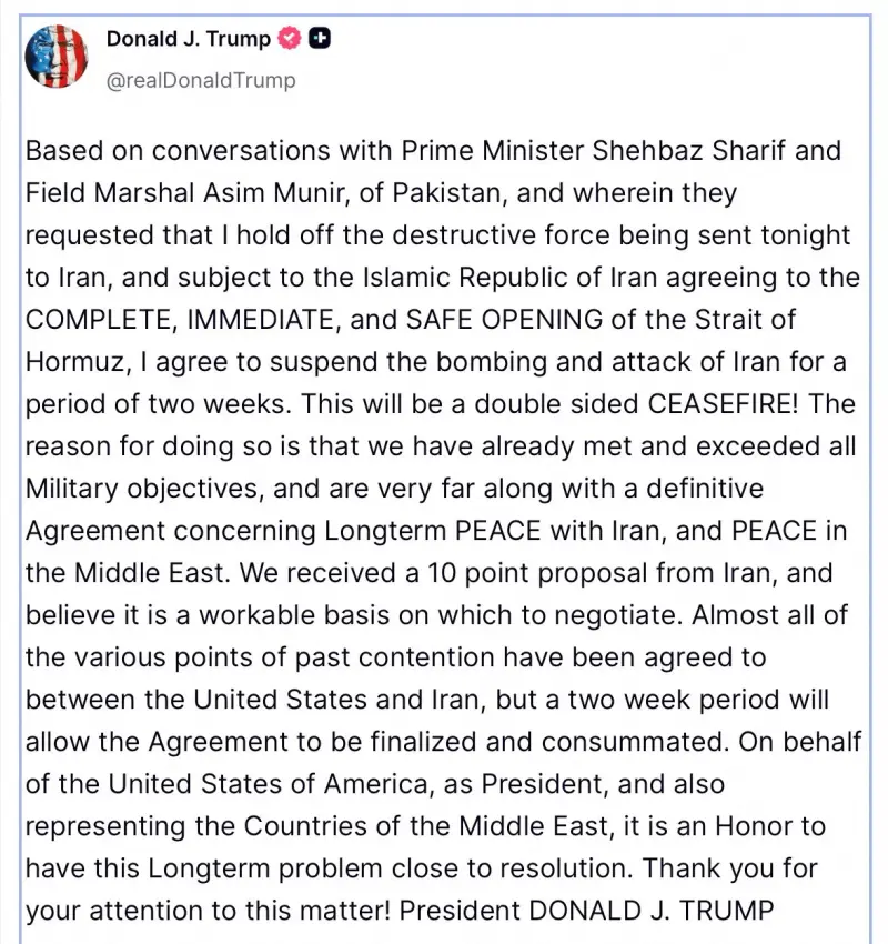 وكتب ترامب على وسائل التواصل الاجتماعي "بناء على المحادثات التي أجريتها مع رئيس الوزراء شهباز شريف والمارشال عاصم منير، من باكستان، والتي طلبوا مني فيها عدم استخدام القوة التدميرية الليلة في إيران، وبشرط موافقة إيران على الفتح الكامل والفوري والآمن لمضيق هرمز، أوافق على تعليق القصف والهجوم على إيران لمدة أسبوعين".