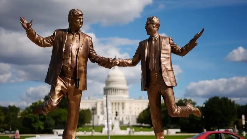 أُعيد الخميس إلى موقعه الأصلي في متنزه ناشونال مول بواشنطن، على مسافة خطوات من مبنى الكابيتول، تمثال ساخر يمثّل الرئيس الأميركي دونالد ترامب ورجل الأعمال الراحل المُدان بارتكاب جرائم جنسية جيفري إبستين، وهما مُتشابكا الأيدي.