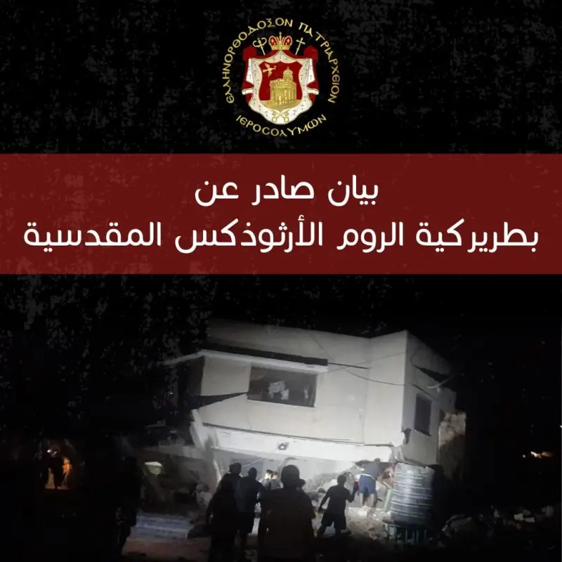 وأصدرت بطريركية الروم الأرثوذكس المقدسية مساء اليوم، بياناً استنكرت فيه، بأقوى العبارات، القصف الاسرائيلي الذي طال احد مباني كنيستها في مدينة غزة.