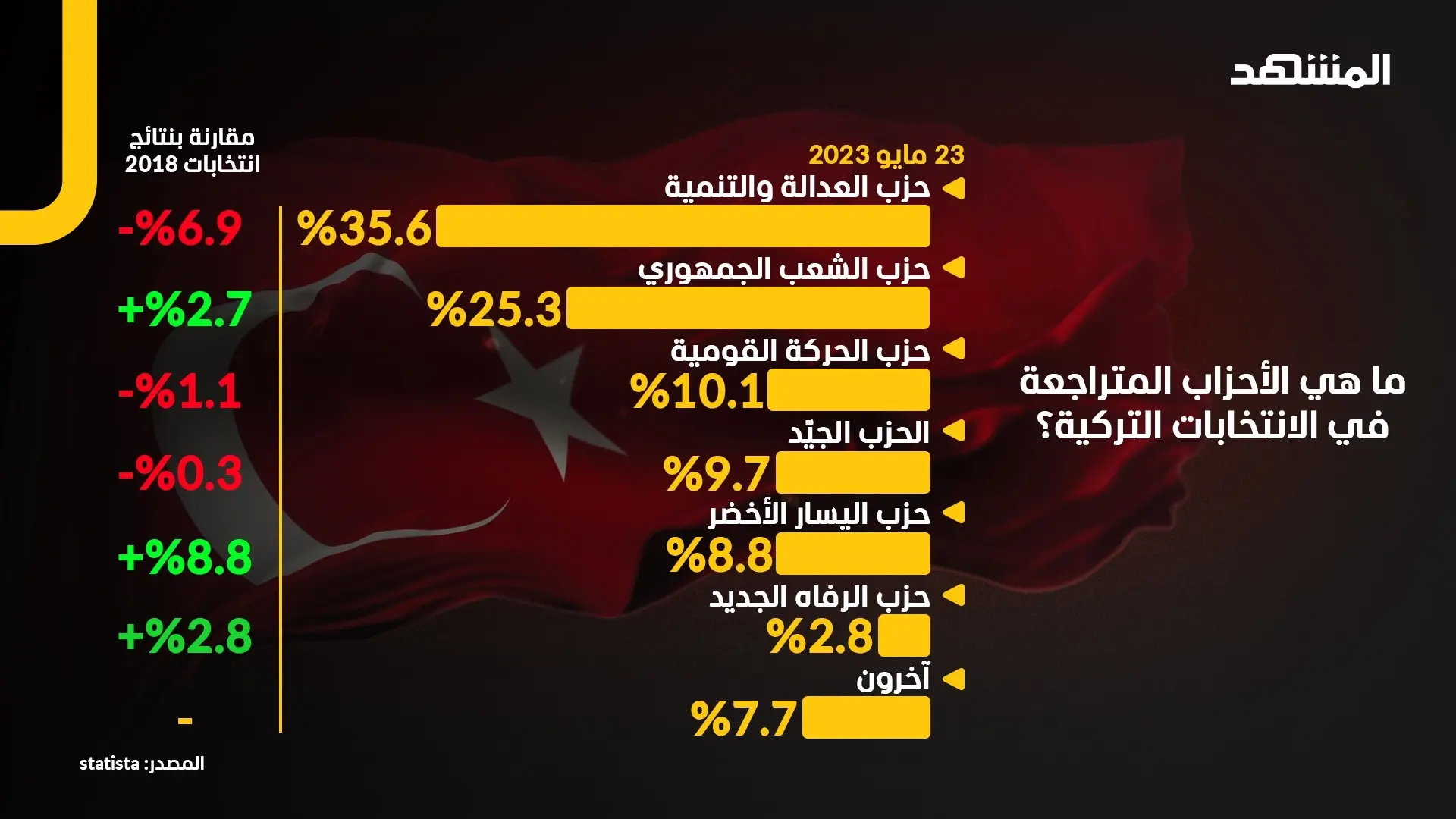 في الانتخابات البرلمانية التركية، التي جرت مع الانتخابات الرئاسية، حصل حزب الرئيس رجب طيب إردوغان العدالة والتنمية (AKP) على 35.6% من الأصوات. وبينما كانت هذه هي الحصة الأكبر من الأصوات لأي حزب، فقد مثلت أيضا خسارة بنحو 6.9% مقارنة بانتخابات 2018. في غضون ذلك، فاز حزب الشعب الجمهوري بنسبة 25.3% من الأصوات (بزيادة قدرها 2.7% تقريبًا مقارنة بعام 2018) ودخل حزب اليسار الأخضر البرلمان للمرة الأولى بنسبة 8.8%.