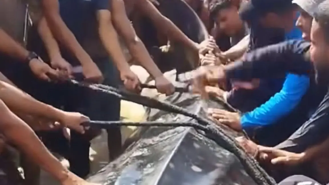 وأظهرت مقاطع فيديو تناقلها ناشطون على مواقع التواصل الاجتماعي حشوداً في خان يونس يسحبون السمكة الضخمة إلى الشاطئ.