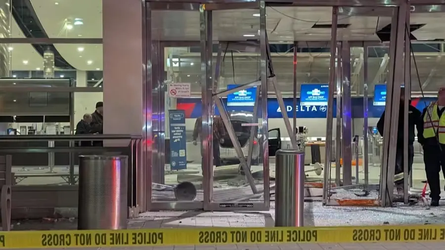 وتناثر الزجاج والحطام على أرض مدخل المطار، ووضعت الشرطة شريطا أصفر حول مكان الحادث.