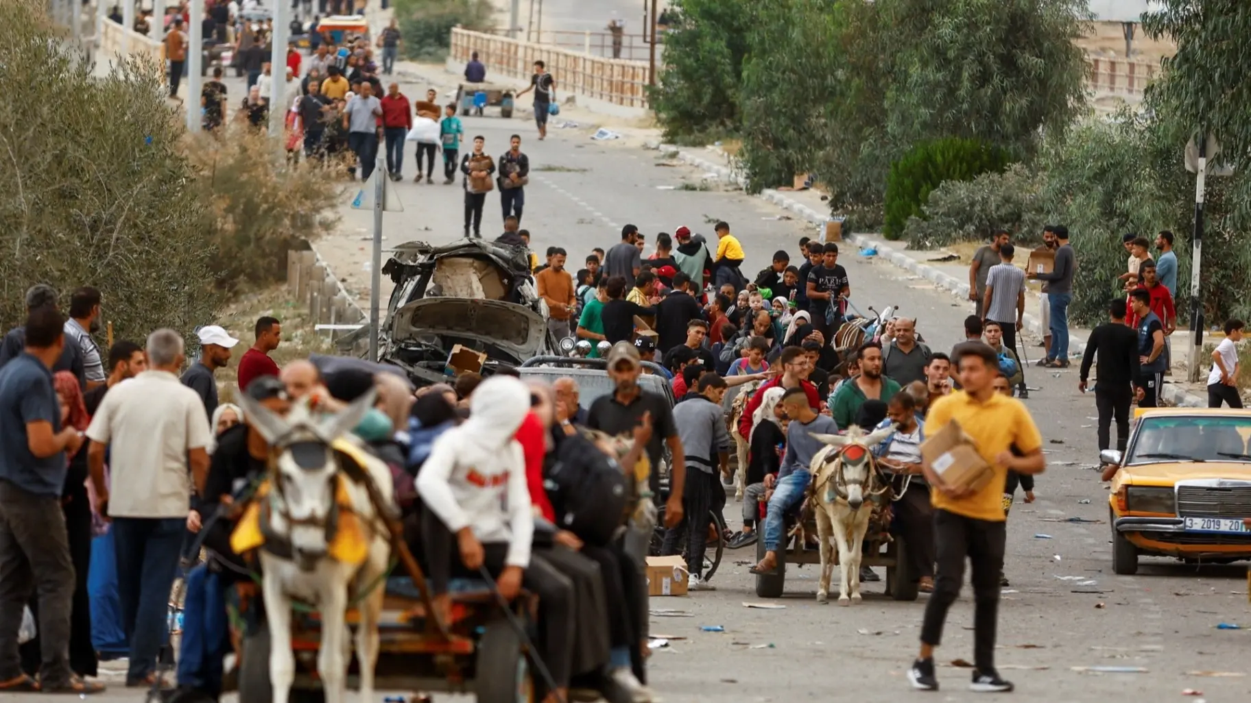 وتنقّل النازحون سيرًا على الأقدام واستخدموا عربات تجرّها الدواب عبر الممر الذي أعلنه الجيش الإسرائيليّ على طول طريق صلاح الدين.