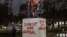 تعرض تمثال رئيس الوزراء البريطاني الأسبق ونستون تشرشل في ساحة البرلمان وسط لندن لعملية تخريب من خلال تدوين عبارات بالطلاء الأحمر تبدو مناهضة لإسرائيل، منها "الحرية لفلسطين" و"أوقفوا الإبادة الجماعية"، بحسب "تايمز أوف إسرائيل".