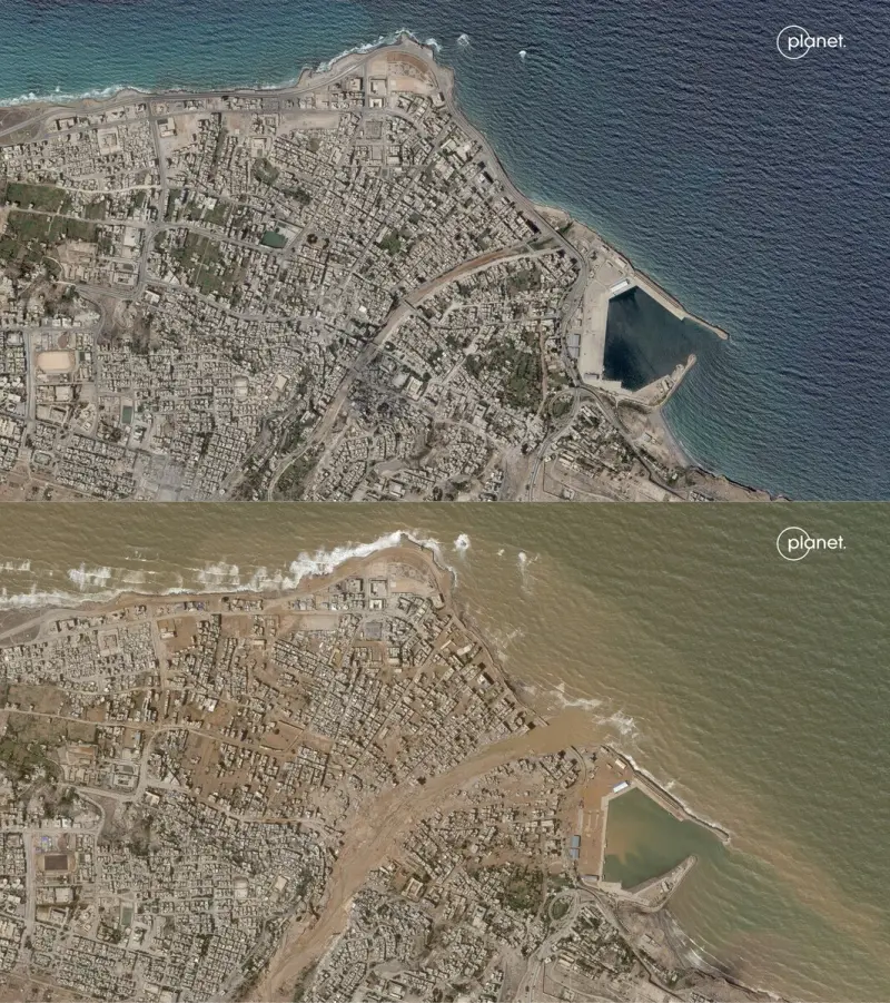 وبحسب الصور التي نشرتها شركة "بلانيت لابز" الأميركية، والتي تضم لقطات قبل الفيضانات وبعدها، فإن مدينة درنة قد دمرت كليا وتحولت إلى أطلال، وهذا ما يؤكده المسؤولون أيضا.
