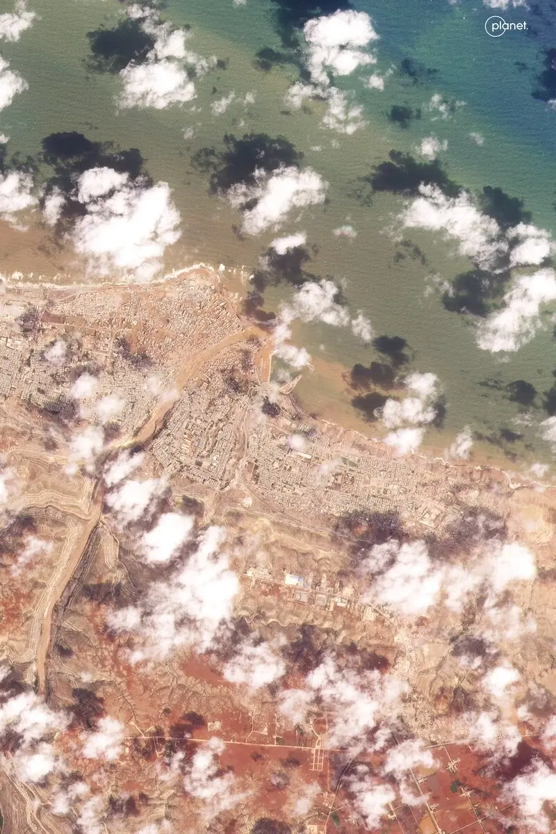 أظهرت صور التقطت عبر الأقمار الاصطناعية، حجم الدمار الذي لحق بمدينة درنة عقب الفيضانات التي ضربت شمال شرقي ليبيا على خلفية الإعصار "دانيال".