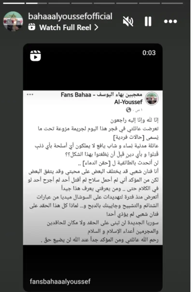 وفي منشور مؤلم عبر حساباته على مواقع التواصل الاجتماعي، عبّر بهاء اليوسف عن صدمته قائلاً: